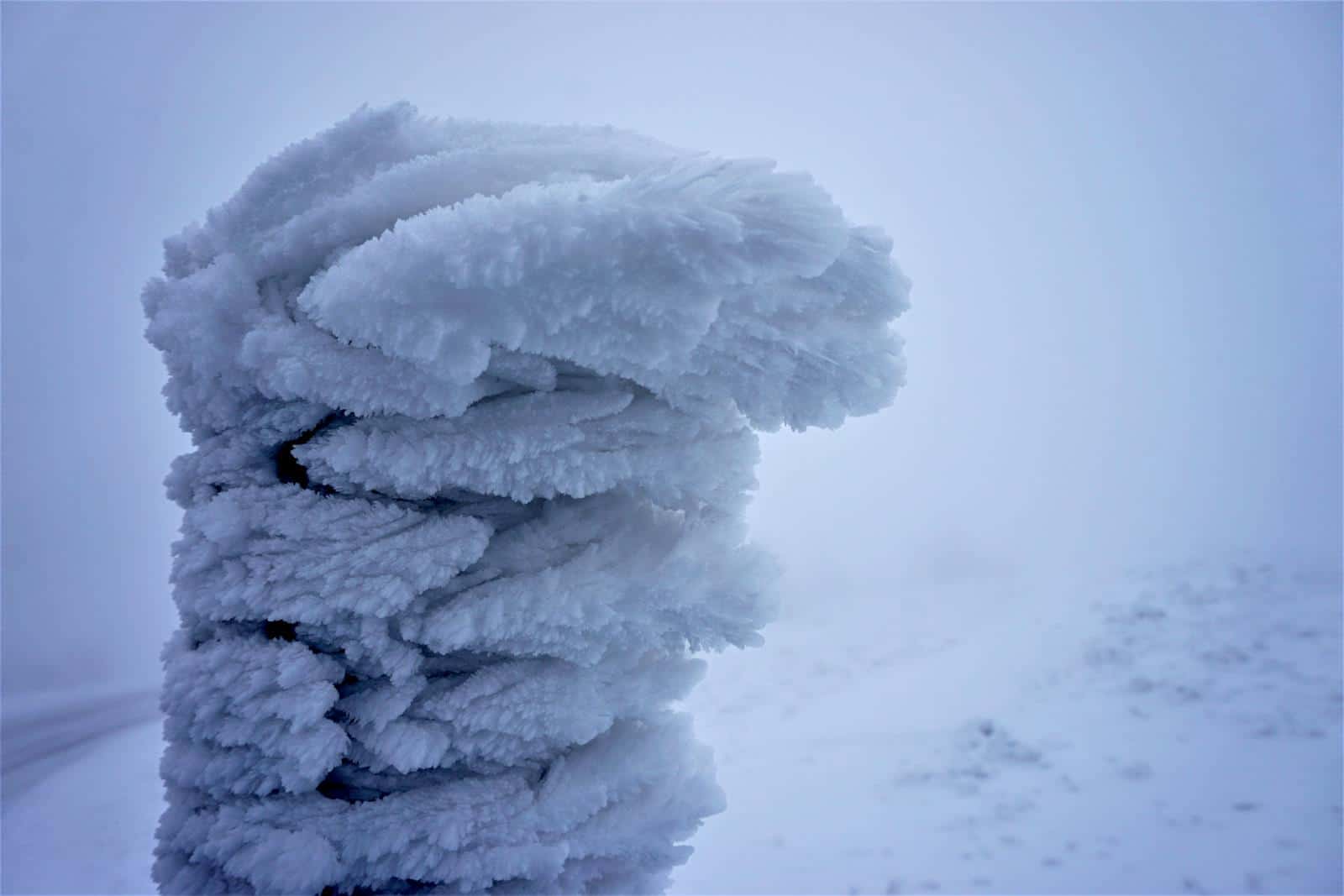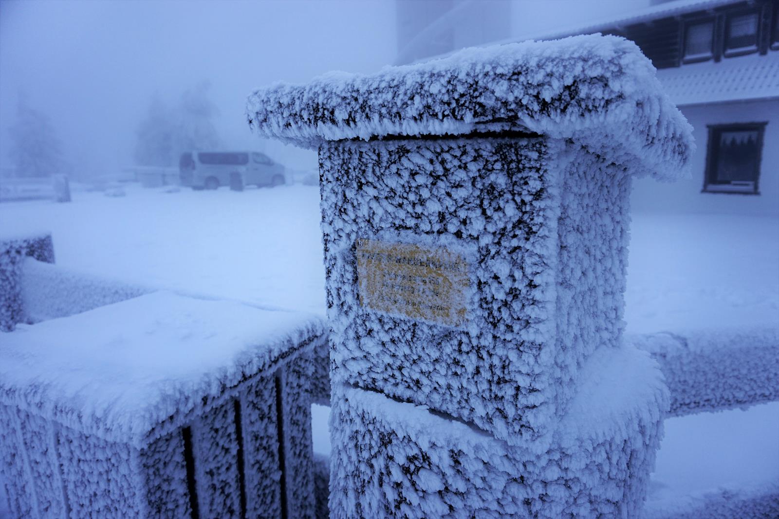 Wir laufen anschließend auf gleichem Weg wieder zum Dreieckigen Pfahl zurück, schagen von hier aber den Weg zum Wurmberg ein. Wer nun denkt, dass es auf dem knapp 200 Meter kleineren, zweithöchsten Berg des Harzes gemütlicher ist, der irrt gewaltig, denn im Laufe des Tages zieht es sich so richtig zu. Mit Sichweiten unter zehn Metern und kaltem Winterwind kämpfe ich mich auf den höchsten Punkt Niedersachsens. Meine Wangen sind von der Kälte gerötet, kalter Eisgries weht mir ins Gesicht. Sogar ein bissschen Gewalt muss ich anwenden, um den Stempelkasten auf dem Wurmberg (8, HWN 156) aufzubekommen.