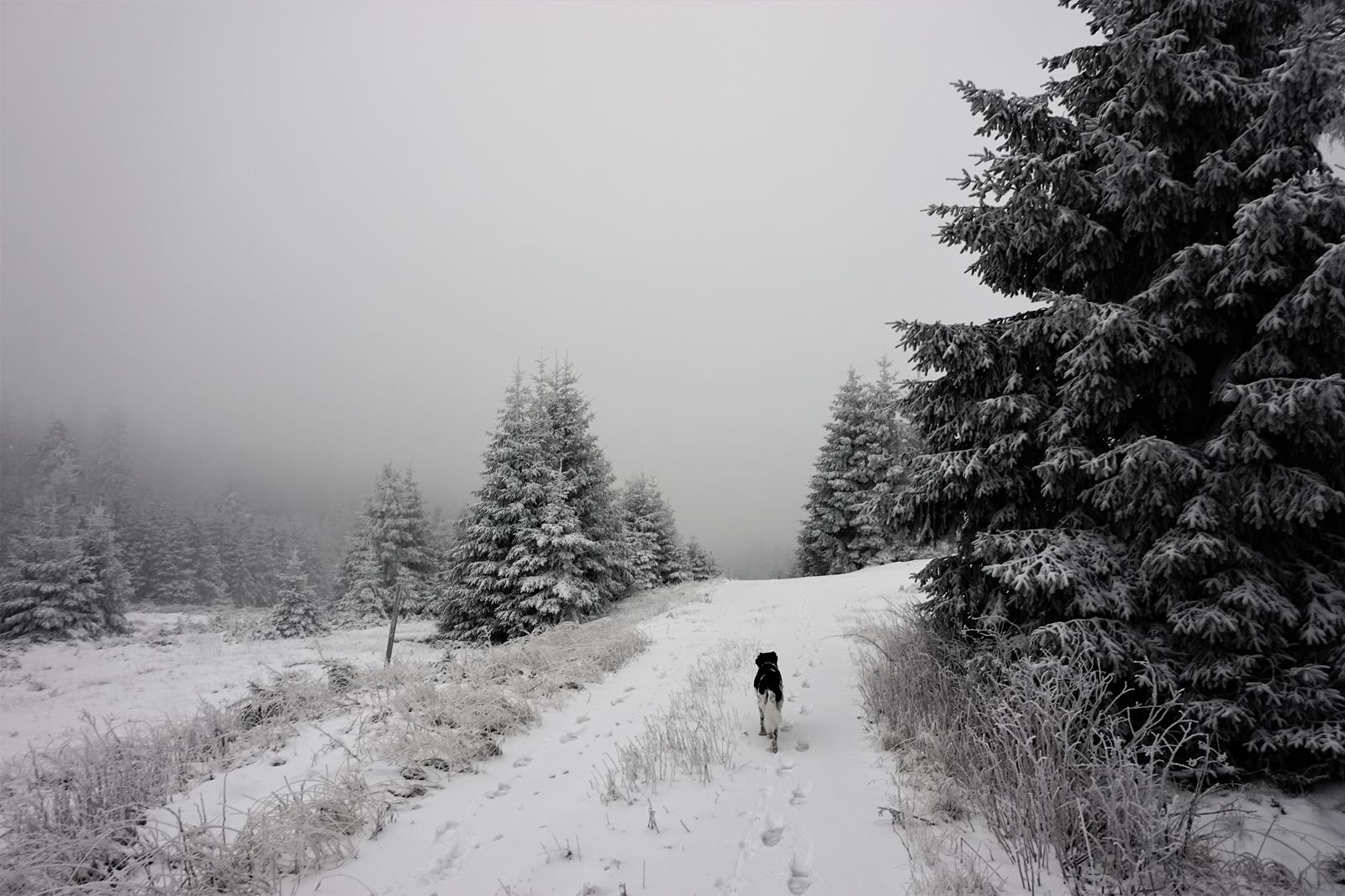 So packte mich an einem Tag mitten im Dezember die Lust auf Schnee und das Gefühl, mich richtig auspowern zu müssen. Ich rang zu Hause noch kurz und intensiv mit dem Schweinhund, behielt aber die Oberhand. Ich ließ ihn schmollend zu Hause und packte stattdessen das Gegenstück in mein Auto: Wanderhund Lotte. Als ich eben diese in Braunlage an der Wurmbergbahn (1) aus dem Auto ließ, schaute sie gleichermaßen verwirrt wie fröhlich auf die weiße Pracht, die uns schon am Fuße des höchsten Berges Niedersachsens erwartete. Sie stürzte sich ins kühle Weiß, tollte wie verrückt herum und war so fröhlich, dass sie allen uns entgegenkommenden Leuten ein breites Lächeln ins Gesicht zauberte.